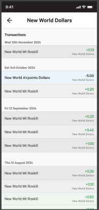 You used to see the Airpoints Dollars™ you earned at New World in your Airpoints™ account after every shop. However since 31 March 2025 you now earn New World Dollars, and when your New World Dollars balance reaches or exceeds 5 New World Dollars these are automatically converted to 5 Airpoints Dollars. Each time your New World Dollars are converted to Airpoints Dollars you will see ”New World Airpoints Dollars” in the ‘Transactions’ section of your New World app, your Clubcard account at clubcard.co.nz and on your Airpoints™ account. Here’s an example of what you can see on the Transactions page in the New World app.