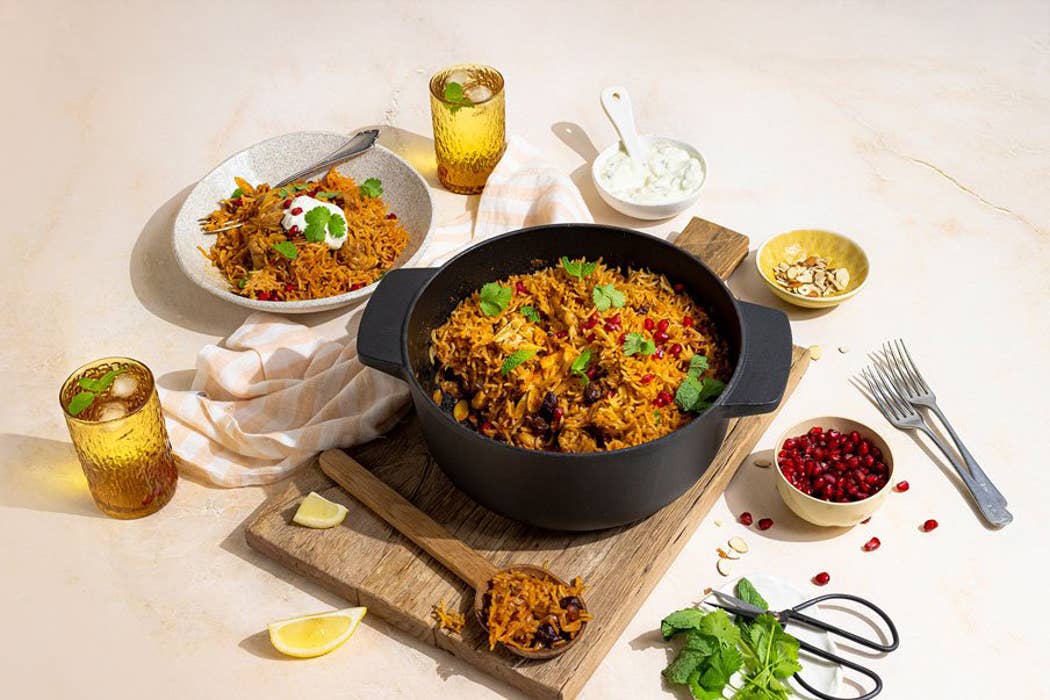 This vegetarian biryani-inspired dish is a one-pot wonder packed with flavour and using just a few ingredients. This makes for an easy but deliciously fragrant meal any night of the week! Packed with protein from chickpeas and pops of sweetness from raisins, this rice dish is a great alternative for any dietary requirement. Eat garnished with fresh coriander, peppers or toasted almonds.