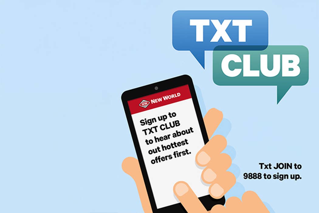 Join New World Text Club to get the latest offers from New World straight to your phone.